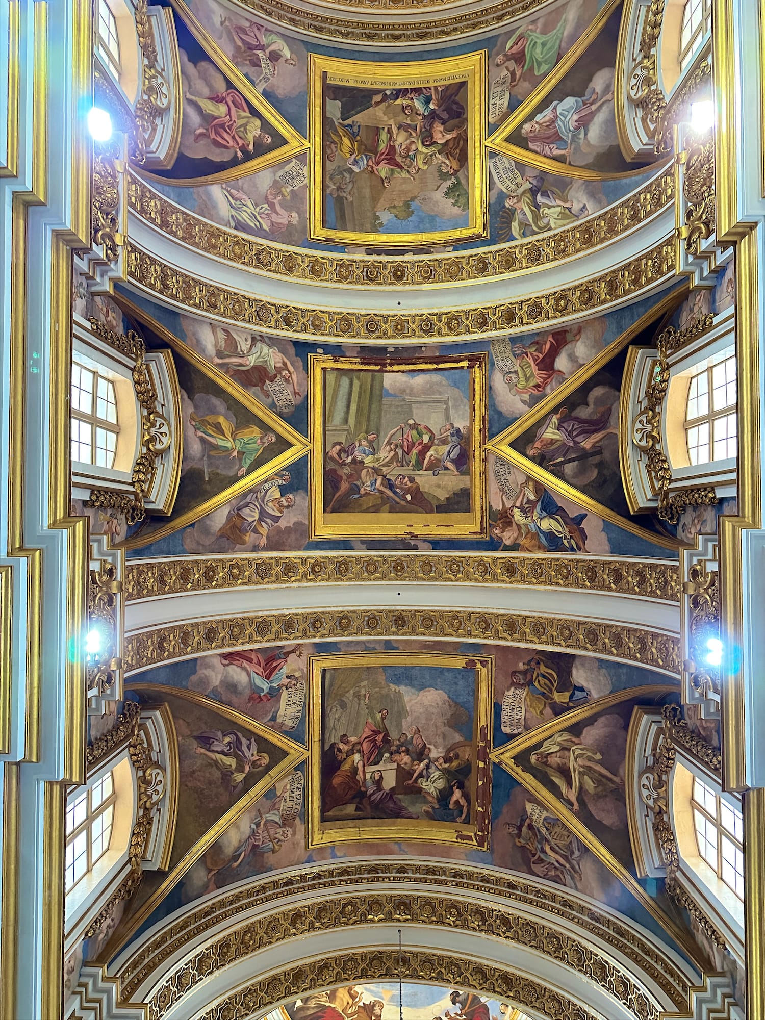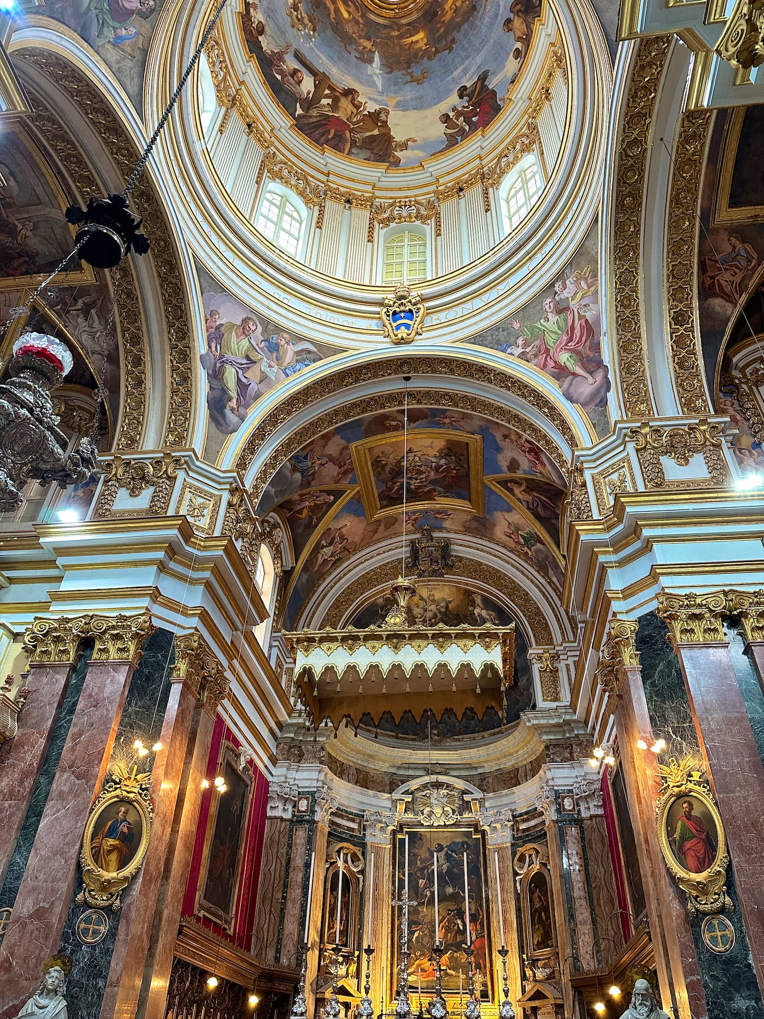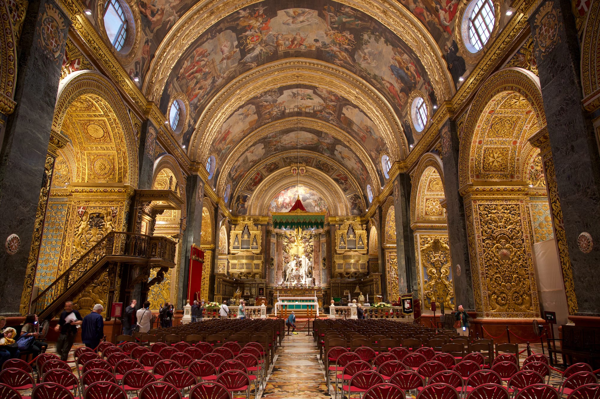 Dall’esterno austera e quasi sobria, la cattedrale nasconde interni che letteralmente tolgono il fiato. Ogni centimetro delle pareti e del soffitto è ricoperto da decorazioni barocche, affreschi, dorature e marmi intarsiati. Il pavimento è un immenso mosaico di lapidi marmoree che raccontano le storie dei Cavalieri di Malta.